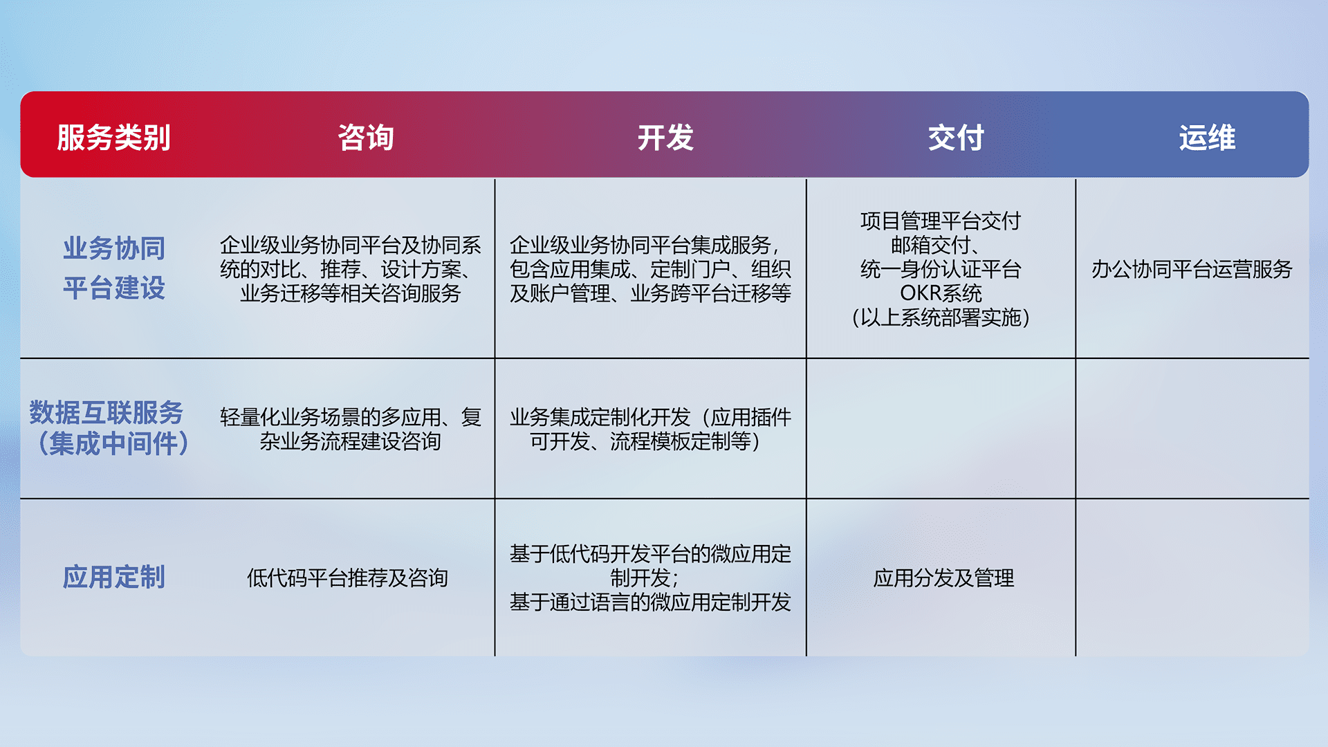 针对钉钉、、企微、、IDaas等平台级产品提供产品的规划、、、方案、、、、交付、、定制化开发等服务,,实现如统一协同办公、、、智能客户服务、、、混合会议管理、、、、智能数据查询、、、等业务场景,,,实现数字化转型。。。